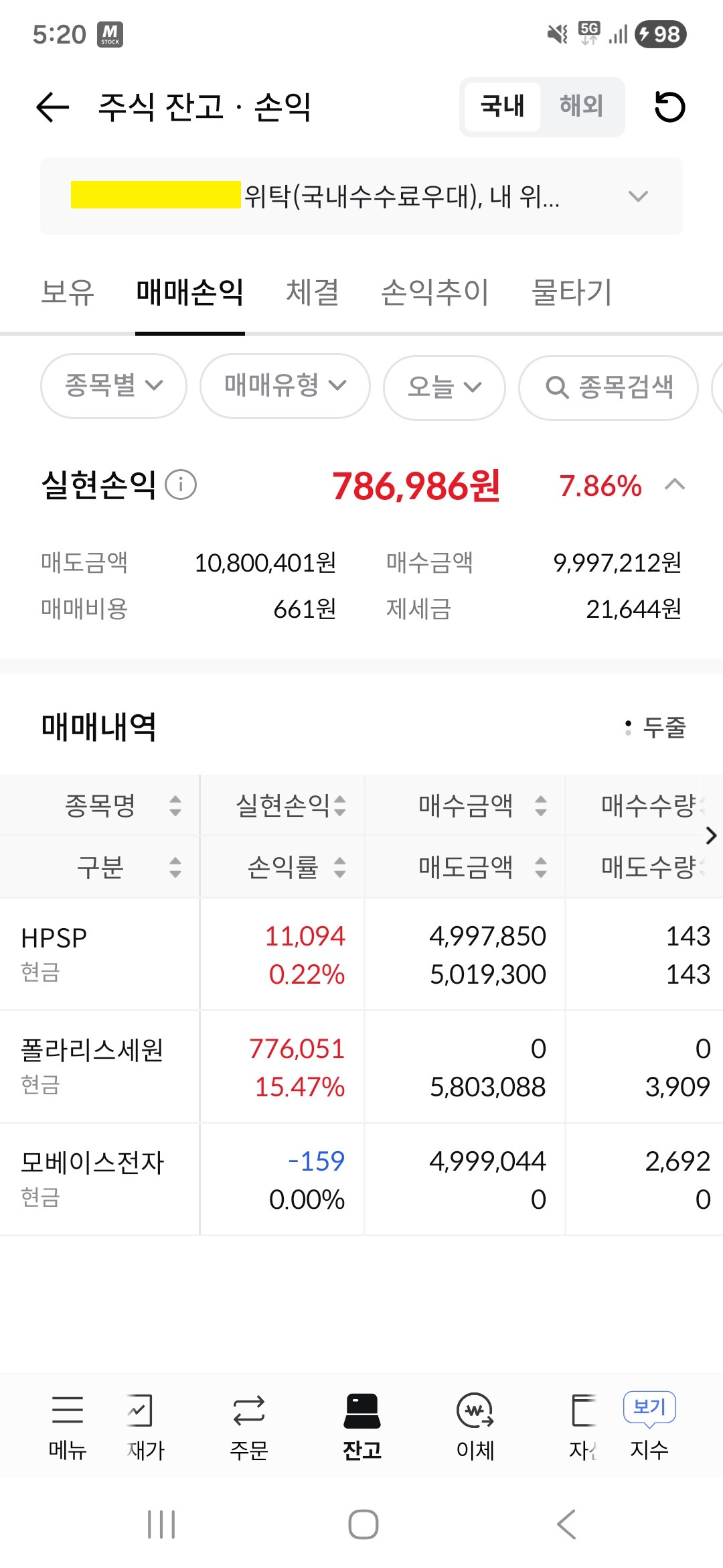 모베이스전자는 매도하지 않았는데 저렇게 매매손익에 잡히는 이유를 모르겠다